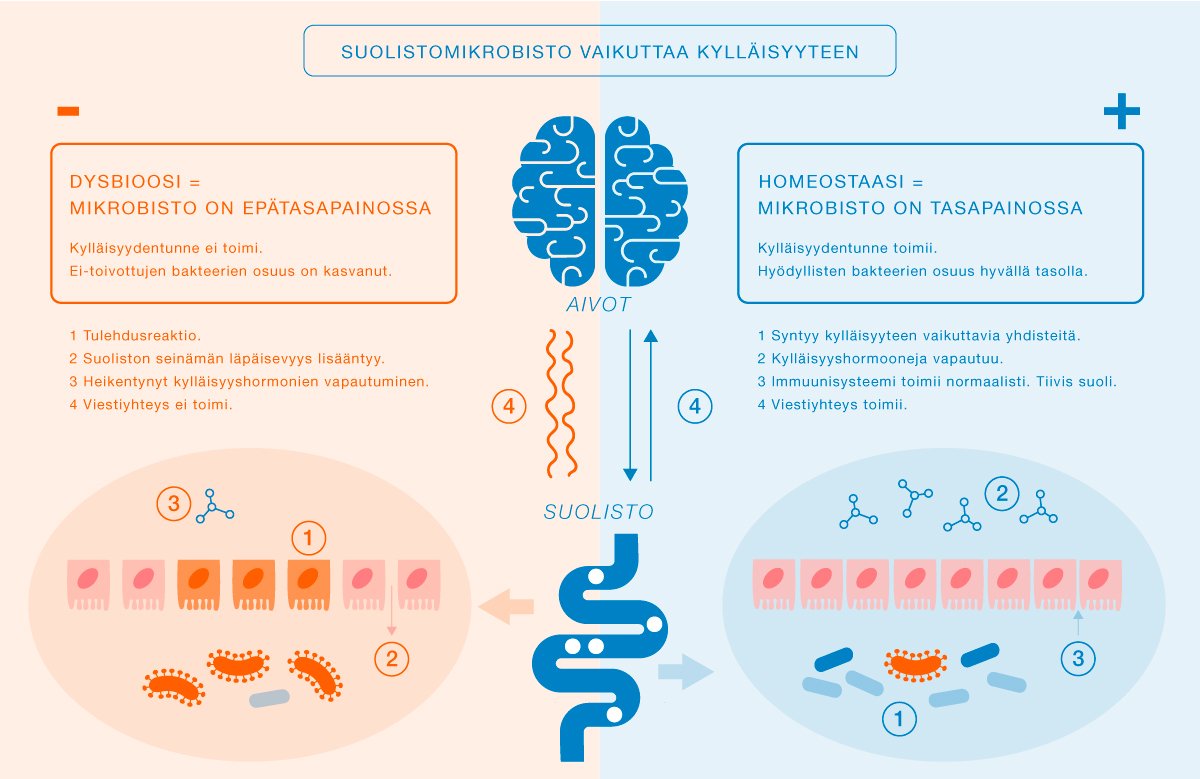 Tietyt hyödylliset bakteeriryhmät, kuten bifidobakteerit, laktobasillit ja Faecalibacterium prausnitzii, käyttävät kuituja ravinnokseen ja tuottavat lyhytketjuisia rasvahappoja, kuten butyraattia, propionaattia ja asetaattia. Nämä yhdisteet ovat keskeisiä kylläisyyden säätelyssä, sillä ne aktivoivat suolistossa kylläisyyshormonien vapautumista ja toimivat viestiaineina aivojen kylläisyyskeskukseen vagus-hermon välityksellä. Hyödylliset bakteerit myös tiivistävät suolen seinämän rakennetta, korjaavat suolinukkaa sekä ehkäisevät ei-toivottujen bakteerien lisääntymistä ja toimintaa.