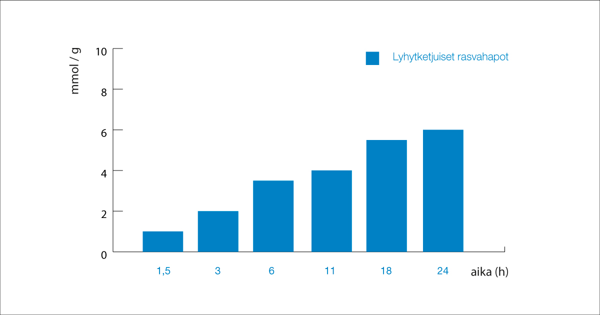 Kuva 2. Bifidobakteerit käyttävät resistenttiä kuitua ravinteenaan muodostaen voihappoa Resistentin maissikuidun vaikutus lyhytketjuisten rasvahappojen erityisesti voihappon määrään 24 tunnin aikana resistentin maissikuitulisän käytöstä. (Flickinger E ym 2000 J Nutr 130(5):1267-1273)